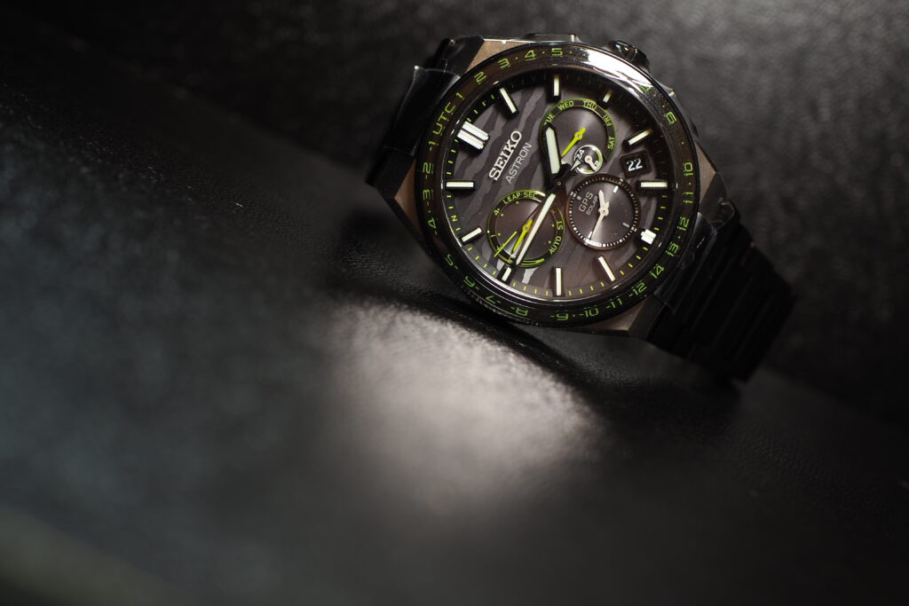 一般的なアストロンモデルとは異なる特徴的なカラーリングが特徴です。シルバーケースとオールブラックブレスレットにライムグリーンのアクセントを効かせており、トレンドを意識したデザインです。さらに、鋭い爪で引き裂いたようなダイヤルパターンがワイルドな力強さを演出しています。