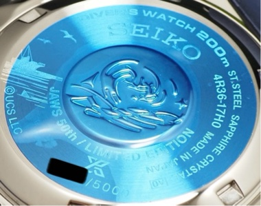 ダイヤルには、海面の表現したグラデーション塗装がされており、光の角度によってサメが浮かび上がります。