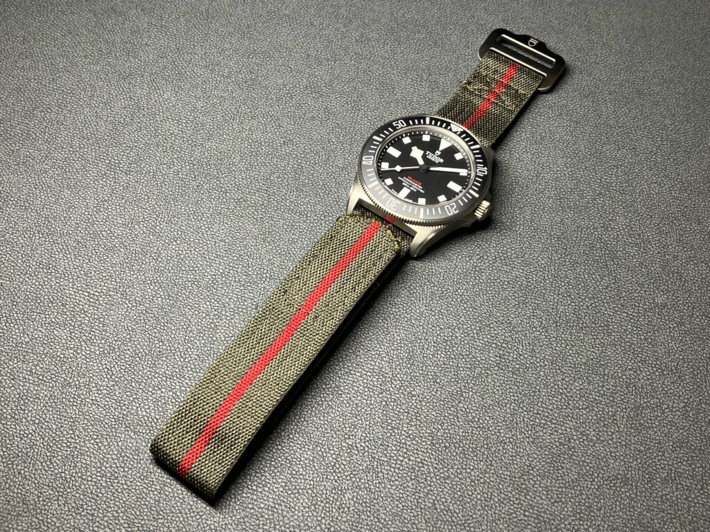 ・フォレストグリーンにレッドのセンターラインが入ったファブリックストラップ