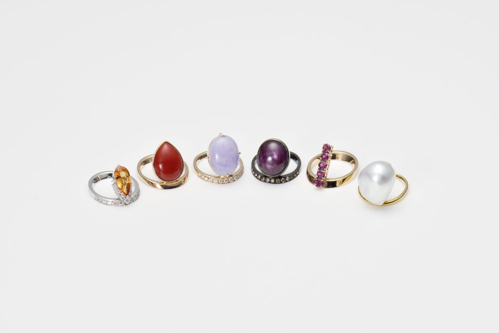 人気のめぐり石コレクションは、リングのアームが楕円になっているのが特徴。