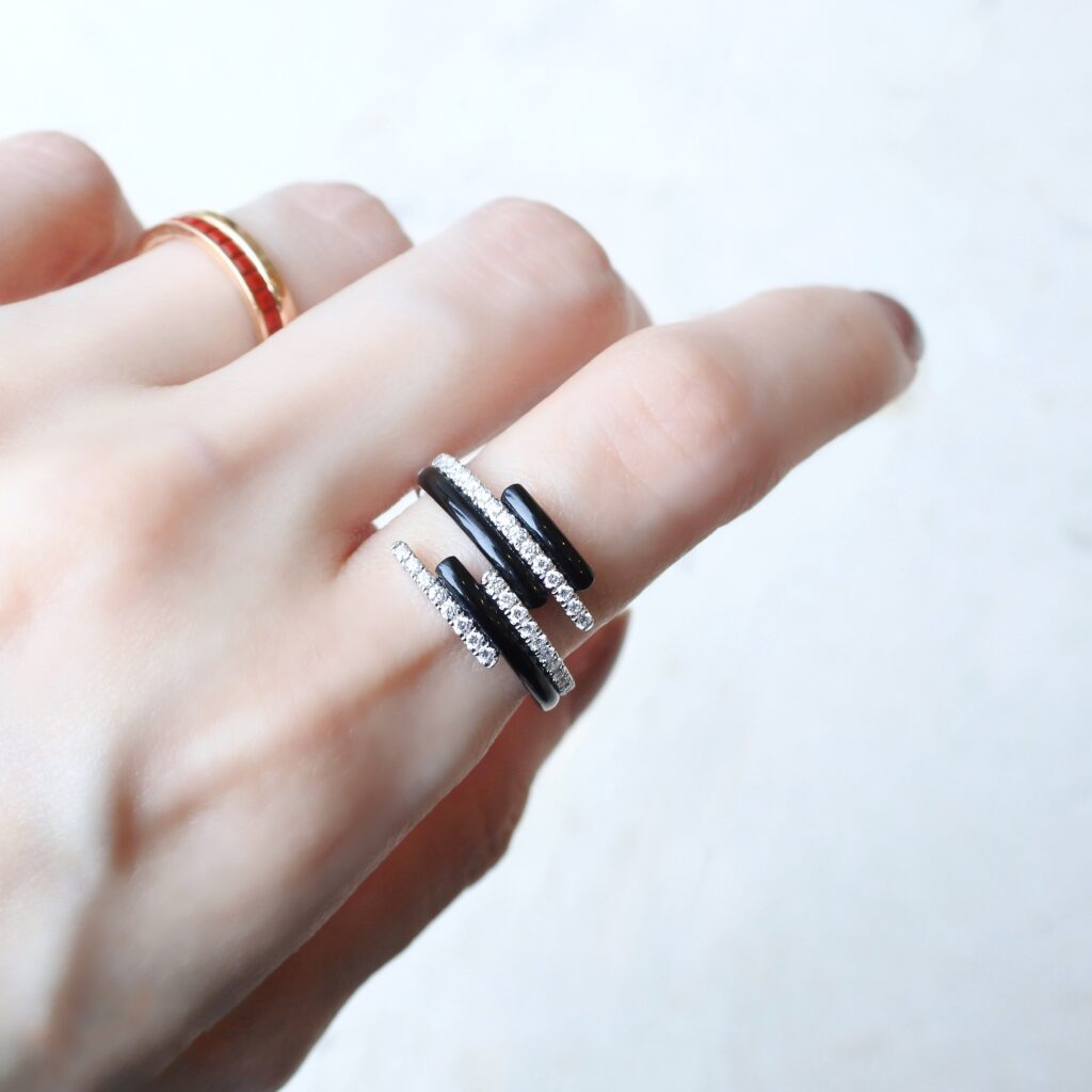 ダイヤモンドと交わらせることで、存在感のある漆黒をモダンな印象に。