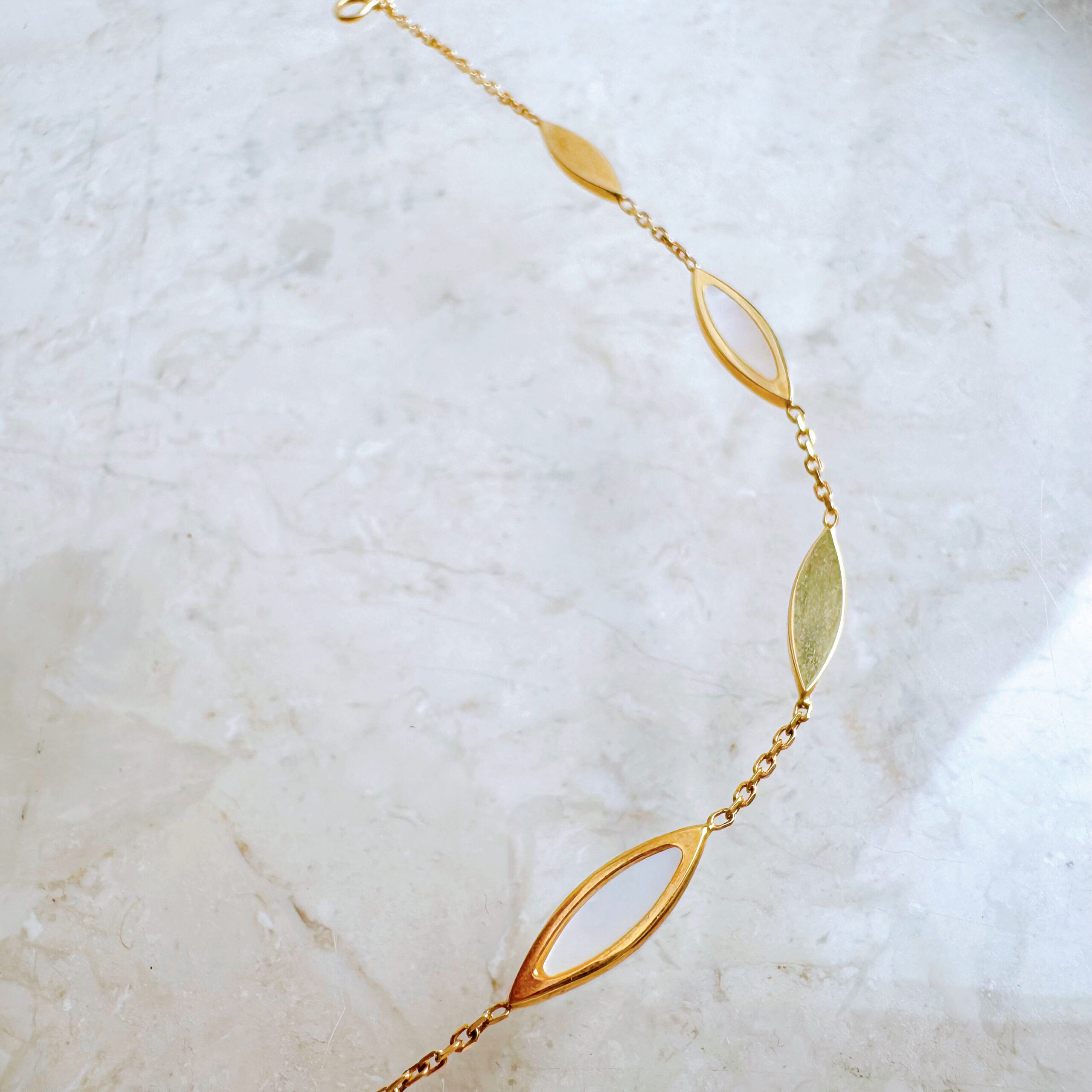 イエローゴールドにシェルをはめこんだブレスレット。