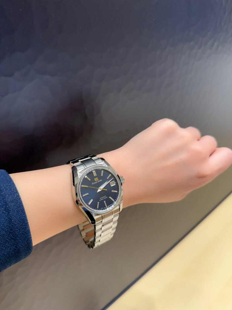 澄んだ夜空の美しい情景をイメージし、濃紺のダイヤルにゴールドの秒針とGSロゴが際立つ配色となっており、情緒深い趣が感じられます。
