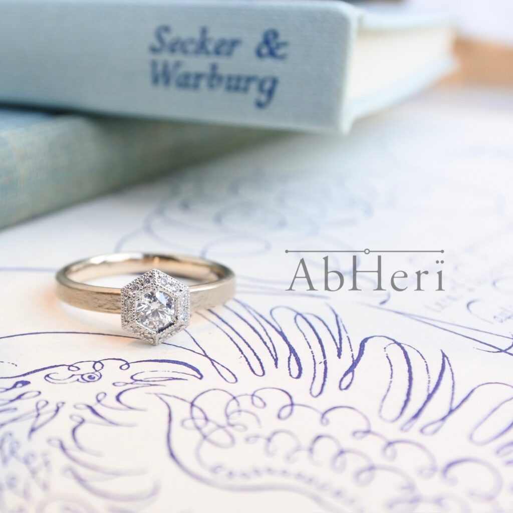センターのブリリアントカットのダイヤモンドを六角形の枠におさめ、周囲はミルグレーションとメレダイヤモンドの精緻な輝きで飾っています。
