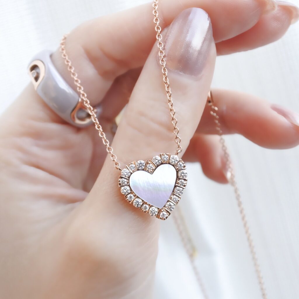 ハートを象ったマザーオブパールを大小のダイヤモンドで縁取っています。