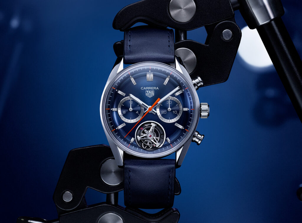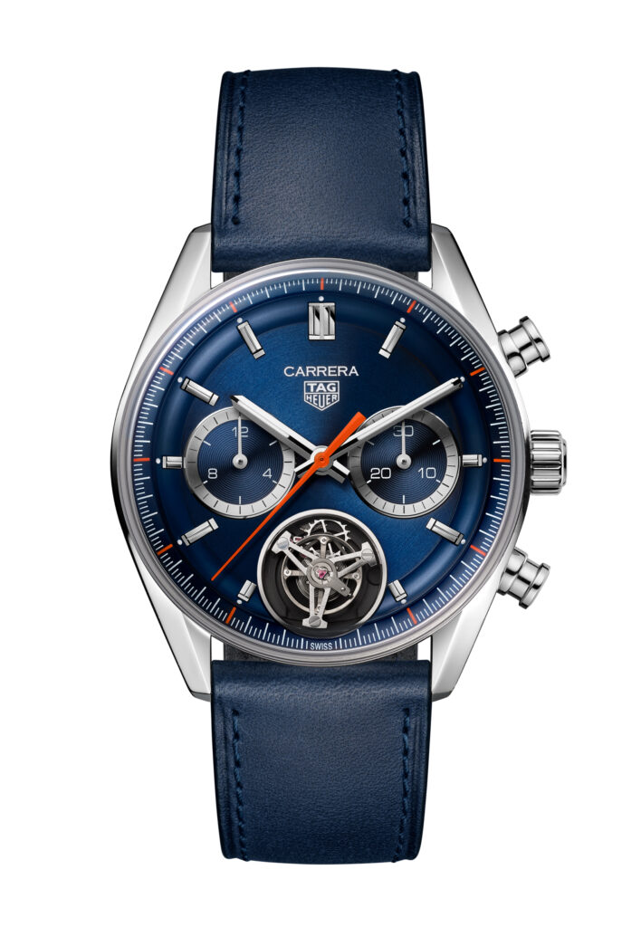 60年経っても失われない偉大さ。カレラの60周年アニバーサリーを堂々と祝す。42mmサイズのタグ・ホイヤー カレラ グラスボックス。オレンジのハイライトが際立つ深みのあるブルーのダイヤルと、自社製トゥールビヨン ムーブメントTH20-09COSCを備えています。