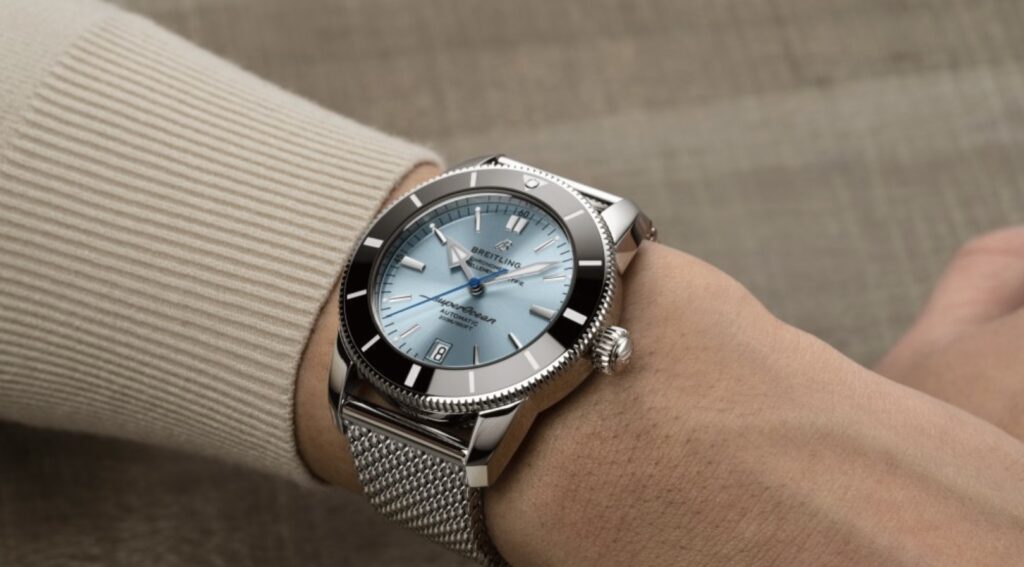このスーパーオーシャン ヘリテージ B20 オートマチック 42 ジャパンリミテッドは、爽やかなアイスブルーの文字盤と水色の秒針が特徴です。