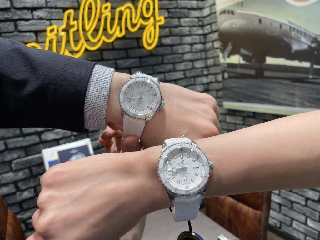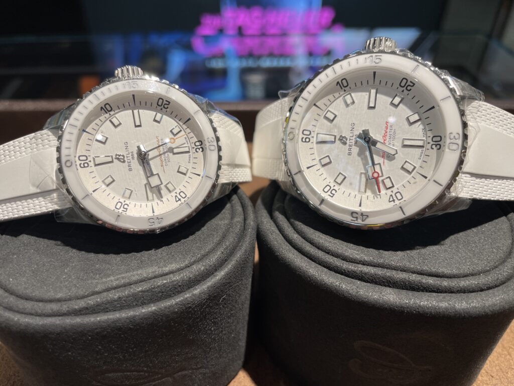 右のスーパーオーシャンは42mmの日本限定です🇯🇵スーパーオーシャンの文字が赤く日本国旗を思わせますね!白に赤が映え、とてもオシャレです✨対して左の36mmはスーパーオーシャンの文字がピンクでやや控えめ!優しい色合いで可愛らしいです😊