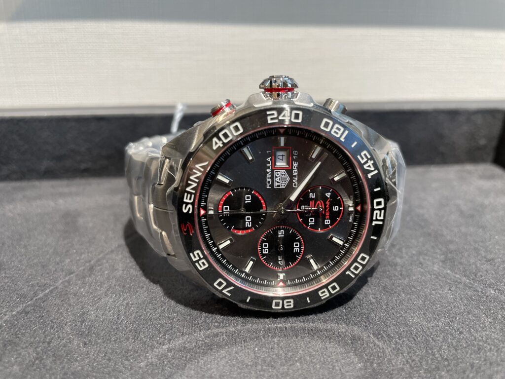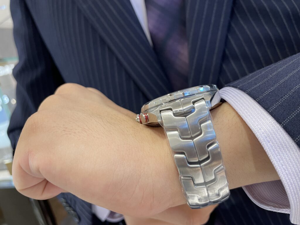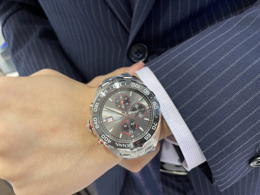 タグホイヤーではお馴染み、リンクのモデルと同じS字ブレスレットになっております!このリンクの前身であるモデル⚡️セナが自身のタグ・ホイヤーのウォッチに付けていた「S/el」にちなんだストラップです☺️普段フォーミュラー1にはつかないブレスレット、特別感ありますよね!