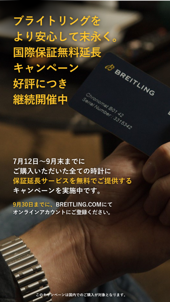 正規店販売店でブライトリングの時計を購入するお客様に対してWARRANTY EXTENTIONを無償で提供するキャンペーンが始まります!簡単にご説明すると保証期間がプラスで延長されます!