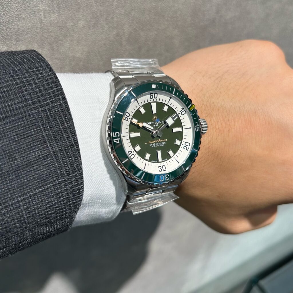 ブライトリングはスーパーオーシャンのグリーンです!この色、なかなか渋くてカッコいいですよね🔥シンプルですがセラミックインレイベゼルや鮮やかな色のダイヤルなど現代的な特徴を加味しています。幅広の針とインデックスには蓄光塗料スーパールミノバ®が塗布され、水中でも読み取りやすい!ウォッチの防水性は300m、さらに衝撃、砂、塩水に対する耐性も有るので安心して使えますよね☺️