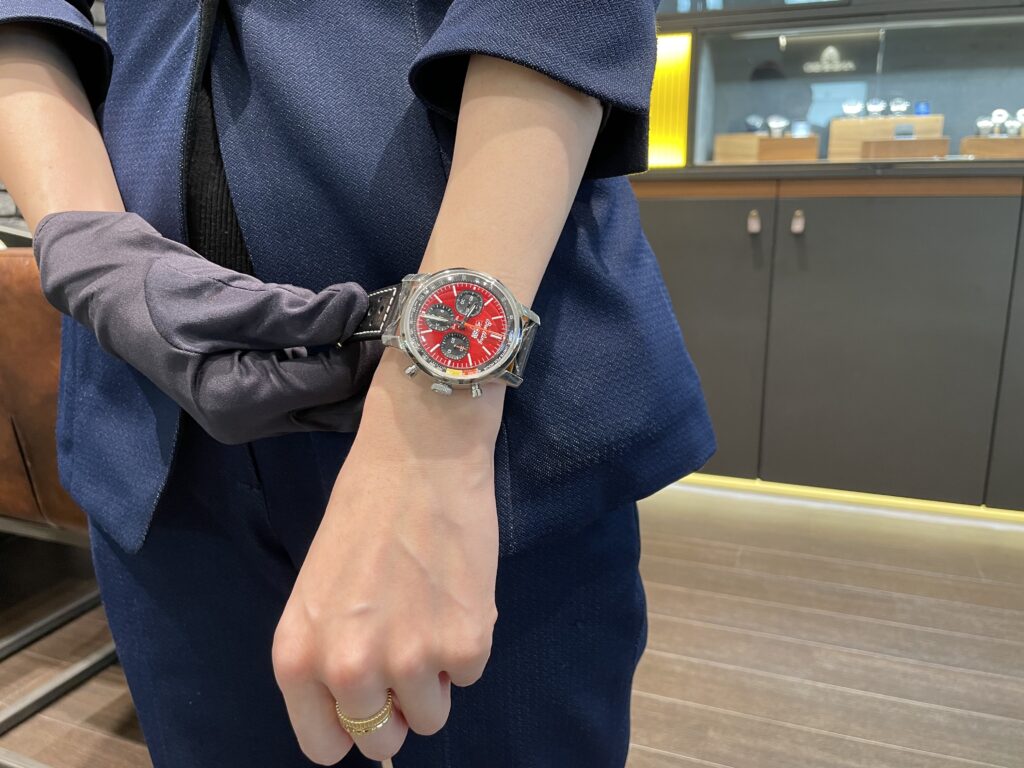 普段は安心堂ウォッチブティックでは置いていないこのトップタイム!実際に店頭で見ていただくチャンスとなっております!41mmと少し女性には大きめのサイズ感ですが、クロノグラフのプッシュボタンが控え目なのでわたしでもすっきり着けこなすことが出来ます