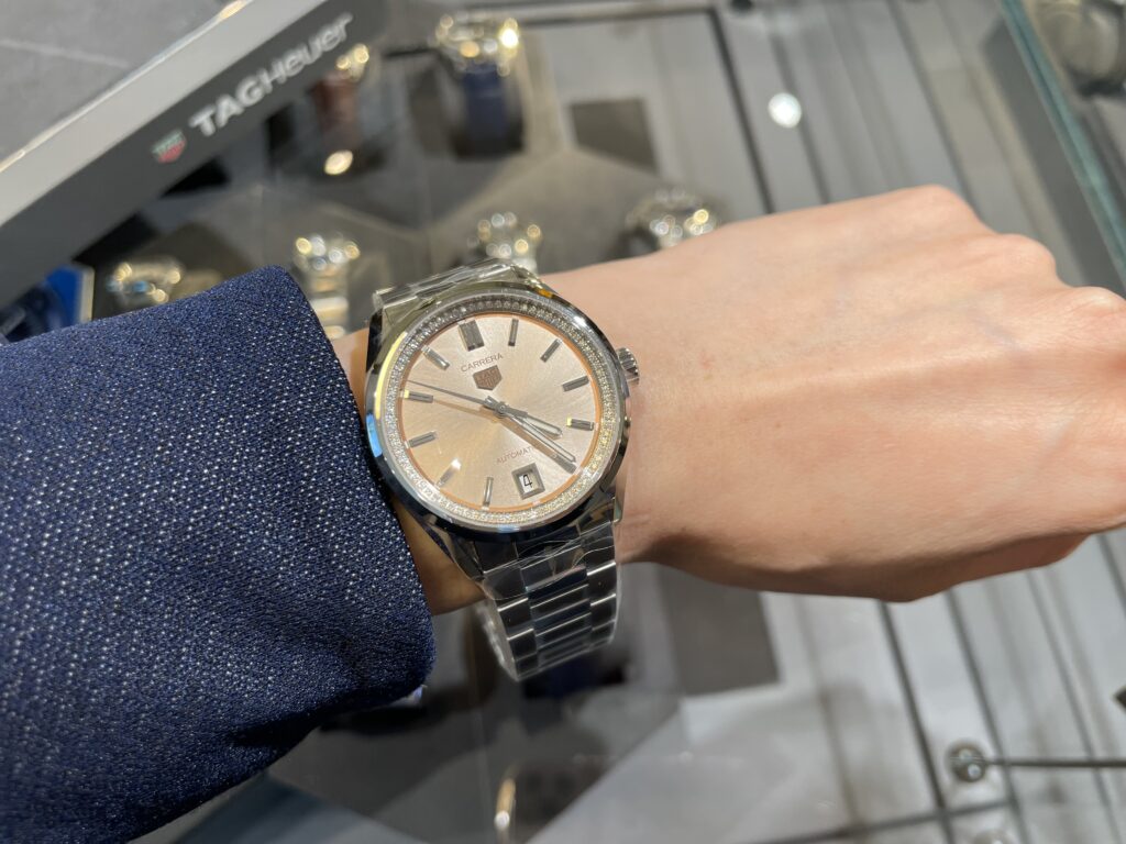 ん〜〜!!!!キラキラでテンション上がりますよね♪キラキラはしていますが落ち着いた上品なパウダリーピンクの文字盤で大人な雰囲気も漂います☆煌めくダイヤモンド(0.288ct) が配置された美しいフランジが囲うこの時計、是非試着してみていただきたいです!!
