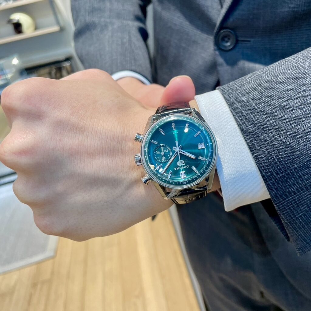 また、こちらのモデルは秒針が無く、クロノグラフなのにシンプルで視認性も抜群です!
