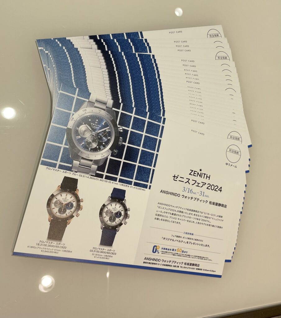 ゼニスのフェアは今月末3月31日(日)までとなっております。ご購入のお客様にはオリジナルノベルティのご用意もしておりますので是非一度売り場に足をお運びくださいね😊静岡でゼニスの時計をご覧いただけるのは正規販売店の安心堂のみです!当店は松坂屋静岡店北館2階の時計フロアにございます!皆様のご来店をお待ちしております!