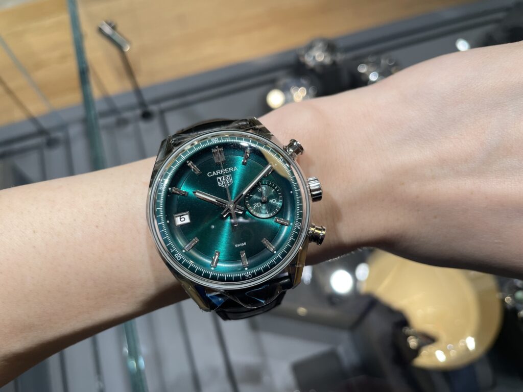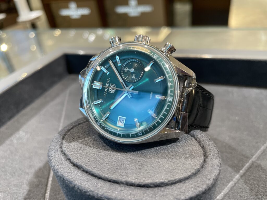 タグ・ホイヤーのカレラ クロノグラフです!とても人気商品ですが、実際見ていただきましたでしょうか???写真でもとても美しいグリーンのカラーですが実際のほうがより深みもあり、爽やかさもありでなんとも言えない美しさです…!