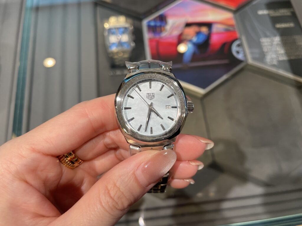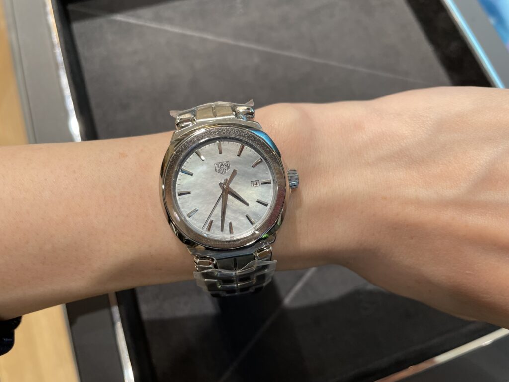 今回は久々登場のタグ・ホイヤーのリンクです☆このマザー・オブ・パールの文字盤は手首の角度によって、トーンの異なるブルーの彩りを見せてくれますよ〜!!シルバートーンのインデックス、針そして12時位置のタグ・ホイヤーを象徴するロゴが、はっきりとしたコントラストを描いていますよね☺️