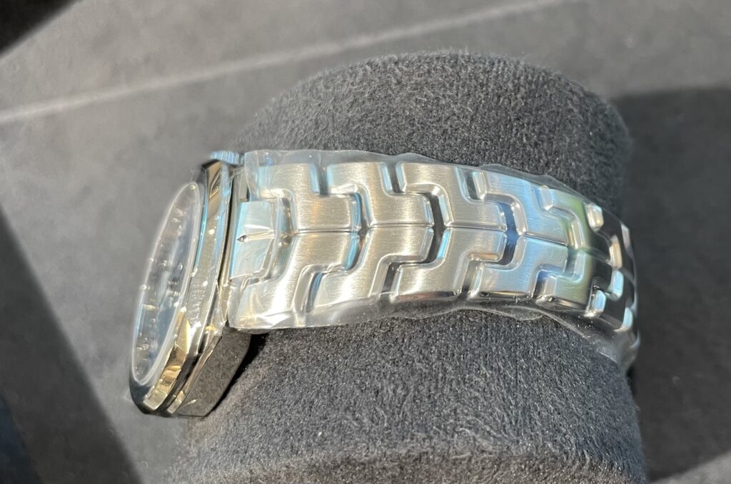 個性的なブレスレットだと思いませんか???リンクはブレスレットのコマに、「S」の形をした“S字型リンク”を採用しており、だれもが一目で分かる外観をもっています☺️この圧倒的な個性は他の時計では味わえないですね!毎度ですが私も着けてみました!