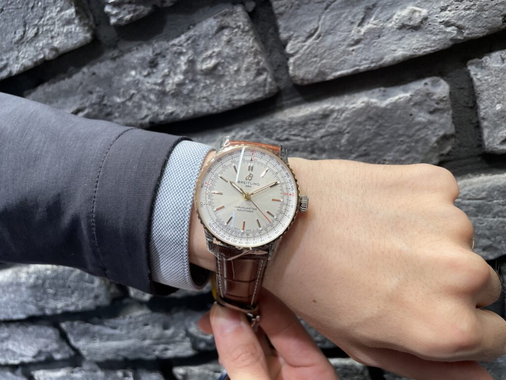 新作のナビタイマーです☺️今回のブライトリングフェアの広告の1番表紙に使われているこのナビタイマー!クラシックでとってもオシャレですよね💫ナビタイマーといえばクロノグラフですがスッキリとしたこの3針はとても見やすく高級感があります🙂↕️全体もご覧ください!