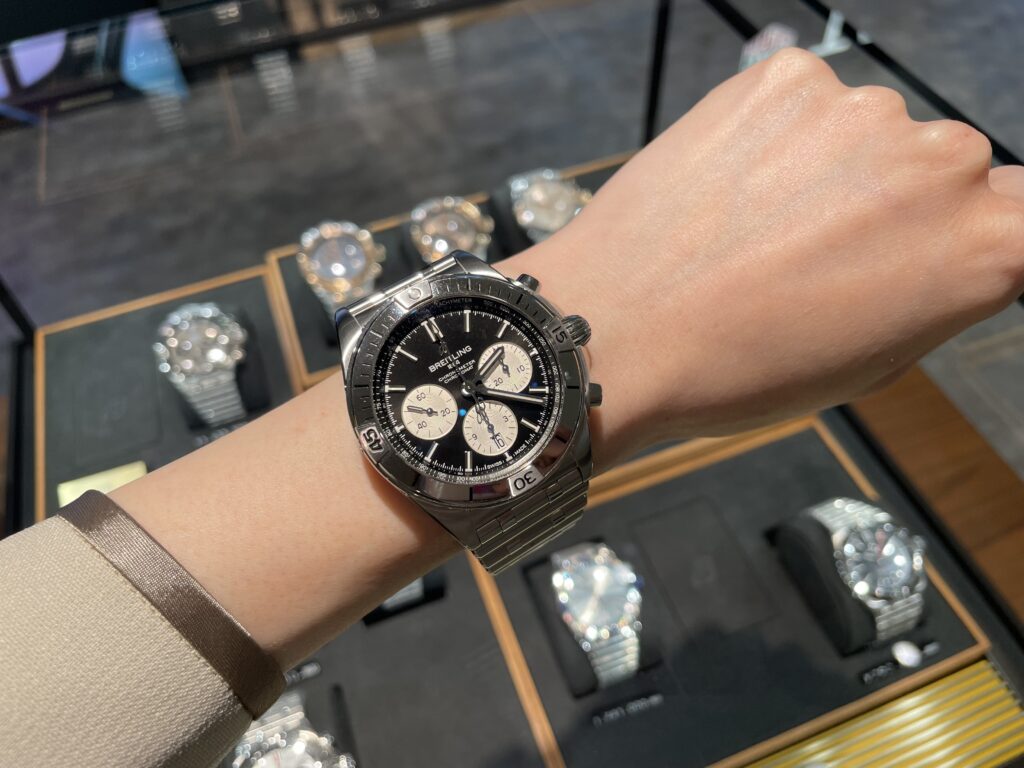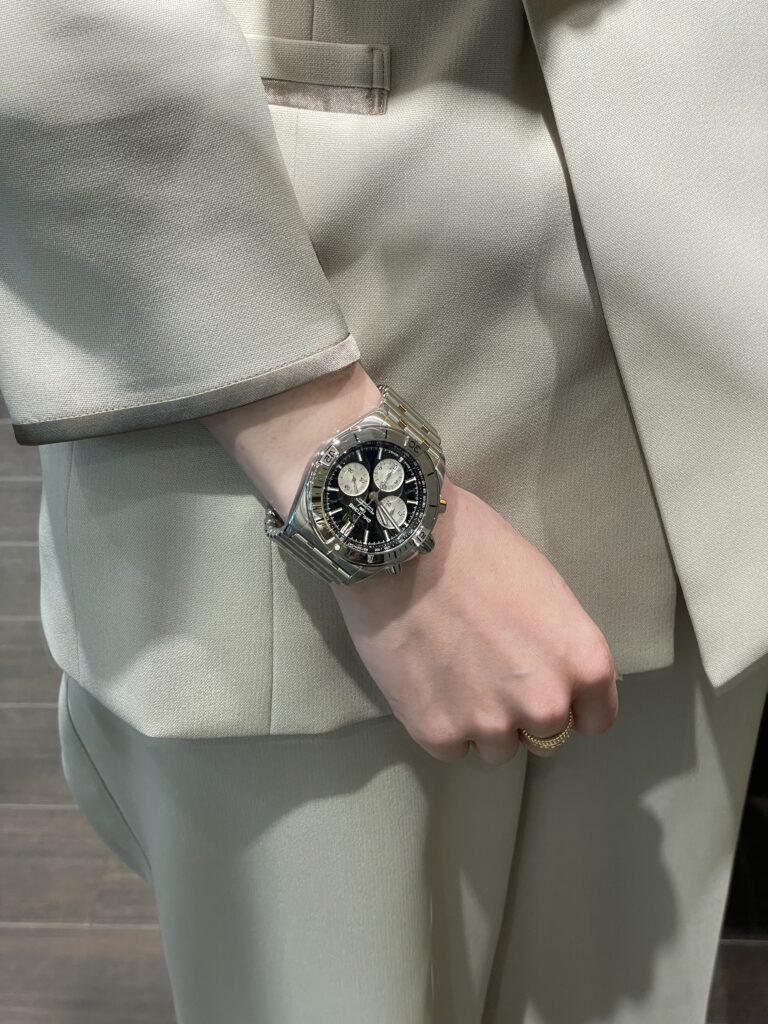 さて本日はブライトリングと言えばのクロノマットのご紹介です!特にクロノグラフのついたクロノマット42mmは男性のものと思っていませんか??そのイメージを今日は変えて見せましょう!こちらご覧ください💫