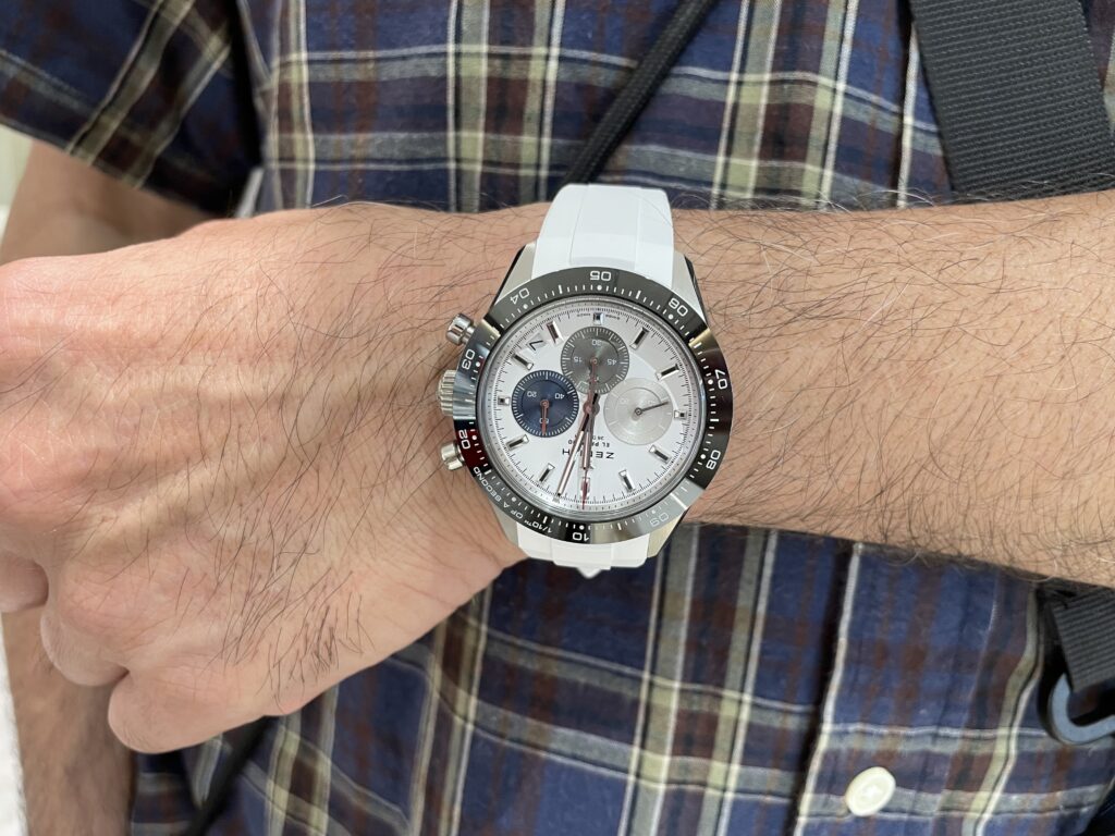 ゼニスのクロノマスターです!付け替え前はステンレスブレスで使用されていましたが、ホワイトのラバーにすると雰囲気がとっても変わりますね💫暖かくなってきたこの時期、爽やかさが増します🙌この夏もたくさん使用してくださいね!いつもお立ち寄りいただきありがとうございます🌸