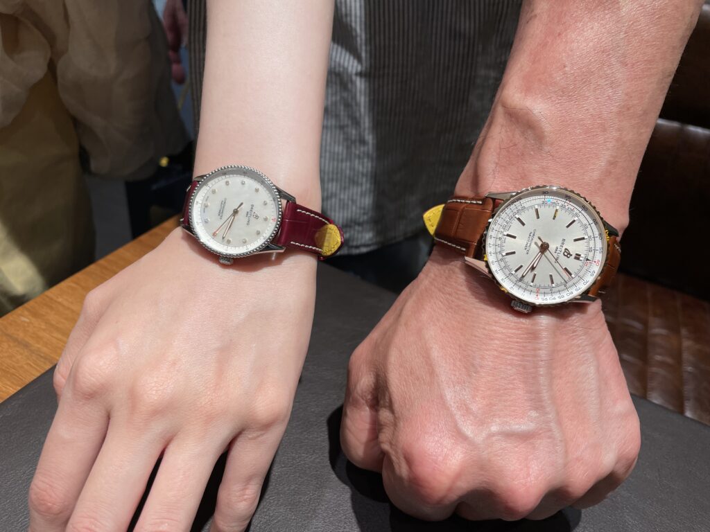 ナビタイマーの新作2本です💫ご家族でご購入いただきました!ありがとうございます😊お二人ともとってもお似合いですね✨小さいお時計は文字盤がシェルになっており見る角度によってカラーが変わります。とても白いお肌にお似合いです🫰💗大きいお時計はシンプルですがベゼル部分が18Kレッドゴールドになっておりシンプルながらもクラシックな一本。お使いになっていたお時計とまた雰囲気が変わって幅広く使いこなせますね🤭