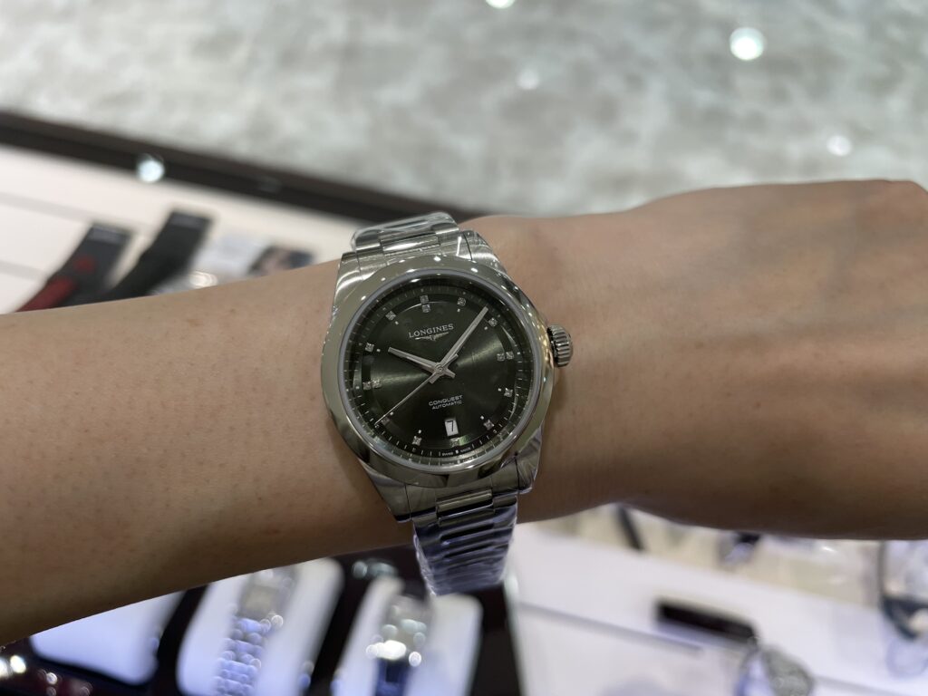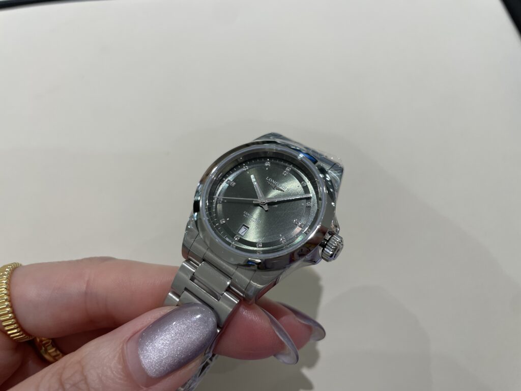 先日ご紹介しましたコンクエストのさらに小さい30mmのケース径のものです😊34mmでも少し大きいな、もうすこし輝きが欲しいなと思った方にはピッタリ✨!15個のトップ ウェッセルトンVS-SIダイアモンド(0.037カラット)をセットした文字盤なのでキラキラと輝いてアクセサリー代わりにもなりますね!