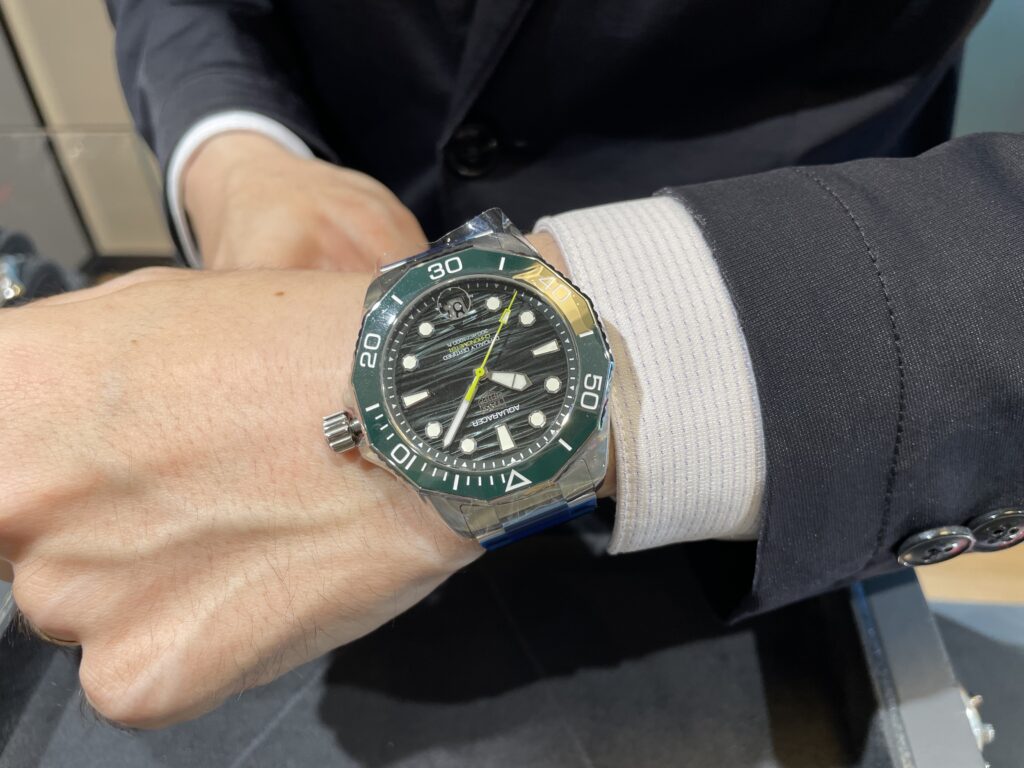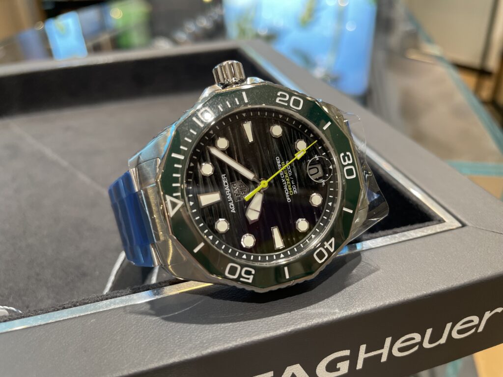 新作のアクアレーサーのグリーンが入荷してきました!ブラック、ブルーがとても良い色だったので期待はしていましたが、やはりグリーンもカッコいい😎!!秒針の鮮やかな黄緑がポイントですね✨着用写真もご覧ください👇