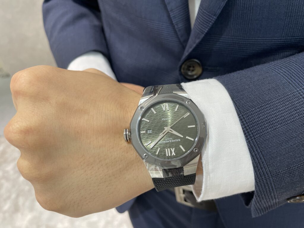 シックに光るグリーンがオシャレ心をくすぐります…🤭見る角度や場所によって文字盤の見え方が変わるので色々なところで楽しめますね✨目立ちすぎず、でも存在感は健在!いいとこ取りの時計ですね🫶自社製ムーブメントよりも少しお値段がお手頃になるのでお悩みの方はこちらも是非ご覧いただきたいです🙆♀️