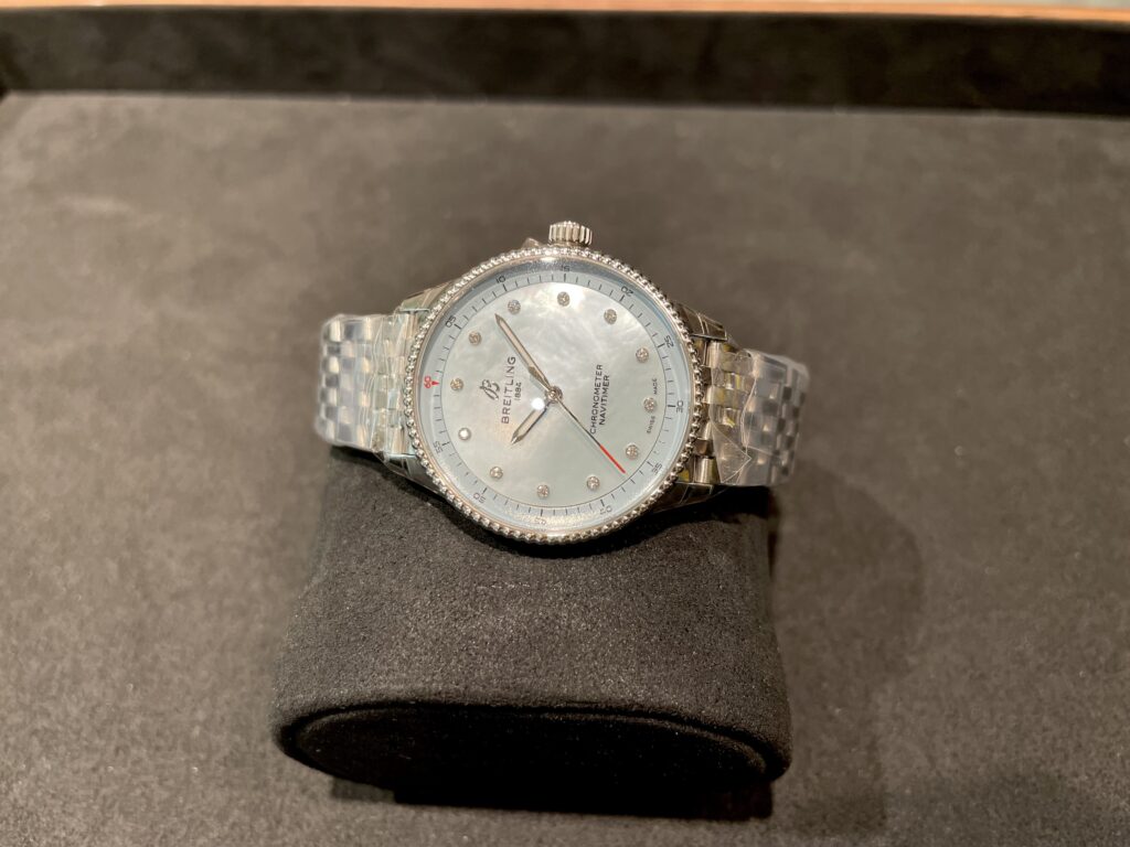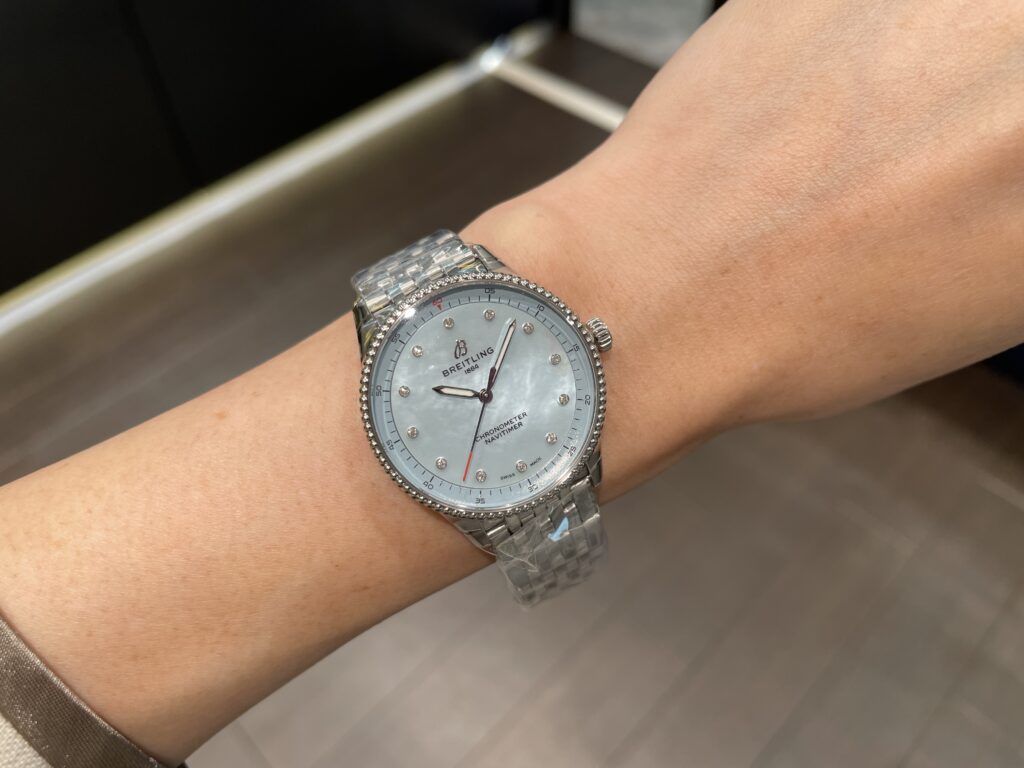 ブライトリングのナビタイマー!!ナビタイマーといえばビーズ装飾のベゼルとアイコニックな回転計算尺がついており一目でナビタイマー!とわかりますよね🥰一方、今回ご紹介しております32 mmモデルは、スリムな直径に適した計算尺のないシンプルなダイヤルデザインを採用💫 パステルカラー、マザーオブパール、トレーサブルな貴金属と洗練された上品さが相まって、ジュエリーのような魅力を放っているのです!!!