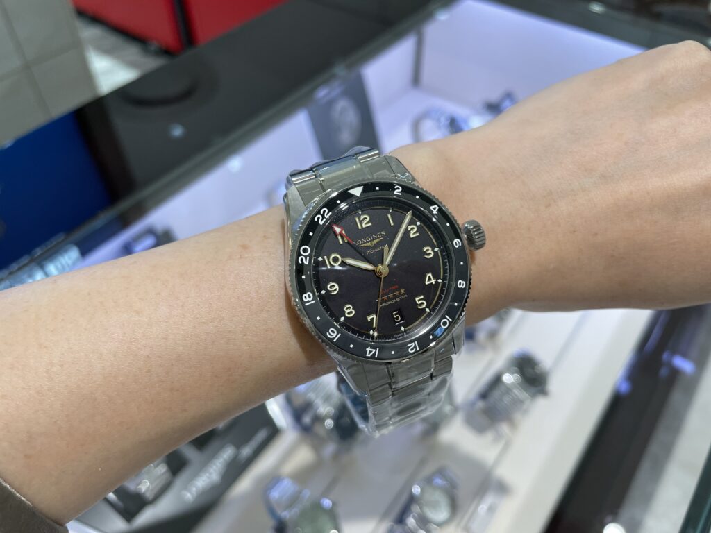 うん!かっこいい!!!視認性も良いのでどこからでも時計の存在をアピールできますね☺️このロンジンのスピリットはカラーもサイズも素材違いもたくさんの種類を展開しているので、ご自身に合った時計が見つかると思います!