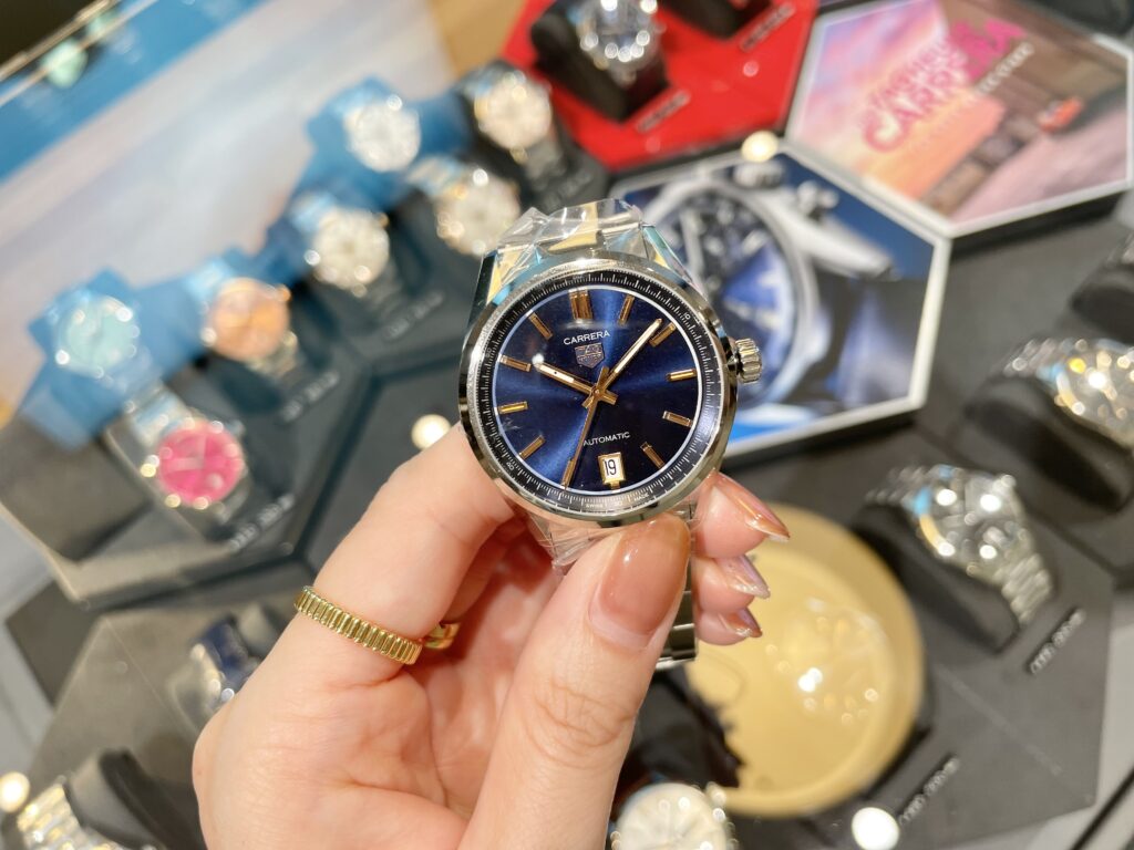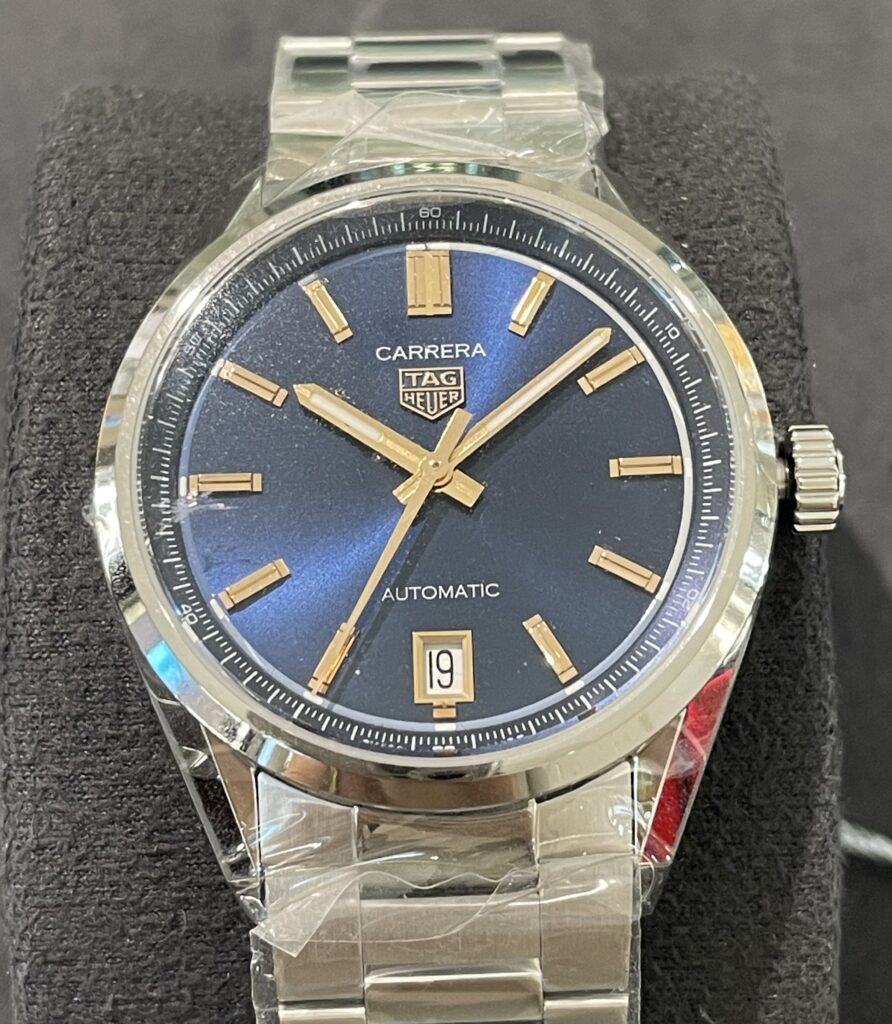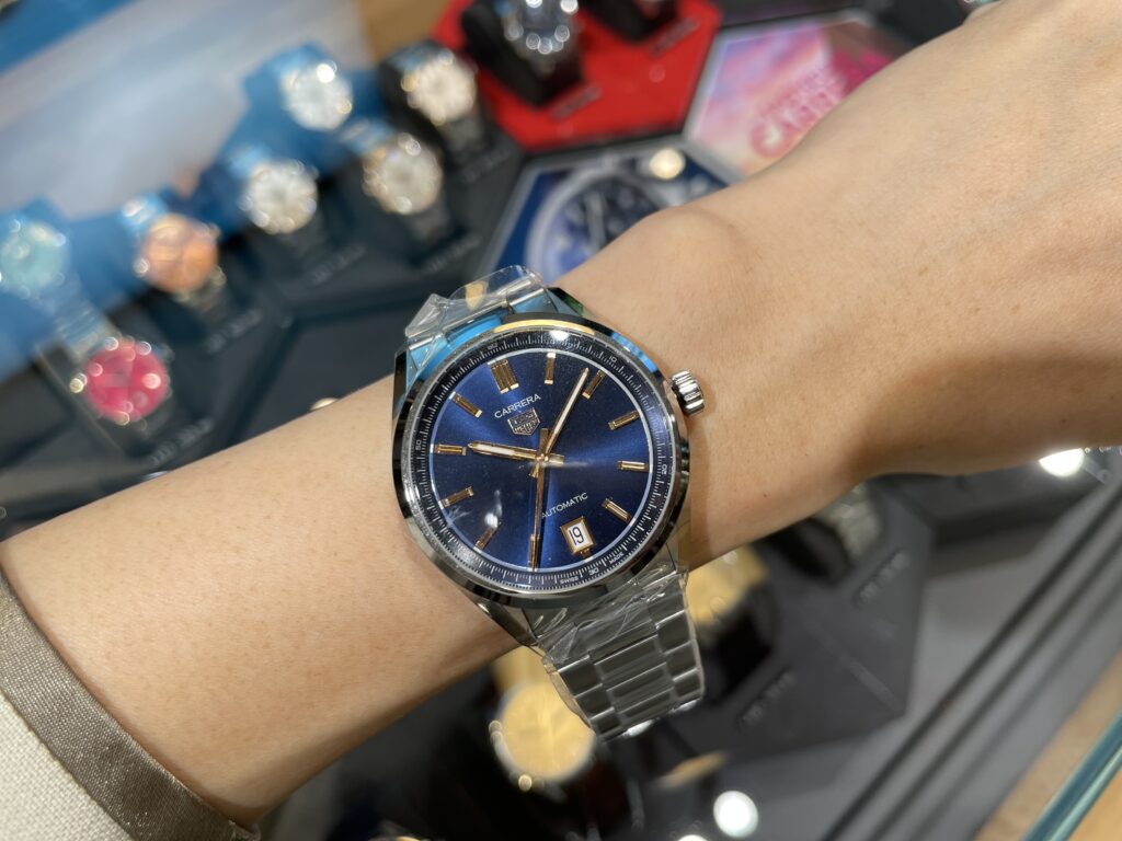 タグ・ホイヤーのカレラデイト!36mmのこのサイズ感は男女ともに人気の大きさです。最近は男性が小ぶり、女性が少し大きめの時計をお選びされてるような気がします🤭そしてこの時計、カラー展開がたくさんあるので目移りしてしまいます🥴どのカラーにしようか…悩んでしまったら、それは一本一本試着してみましょう!!何本でもお付き合いしますよ🫰そのなかでもやはり私は今回ご紹介しております、このブルーがお気に入りです。