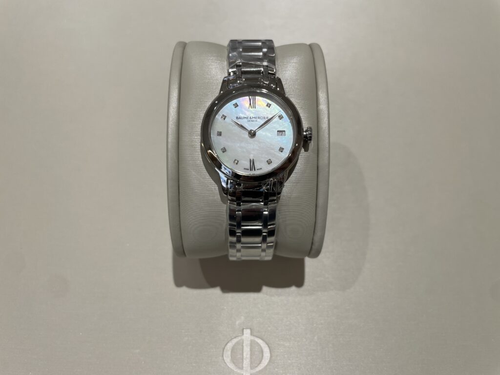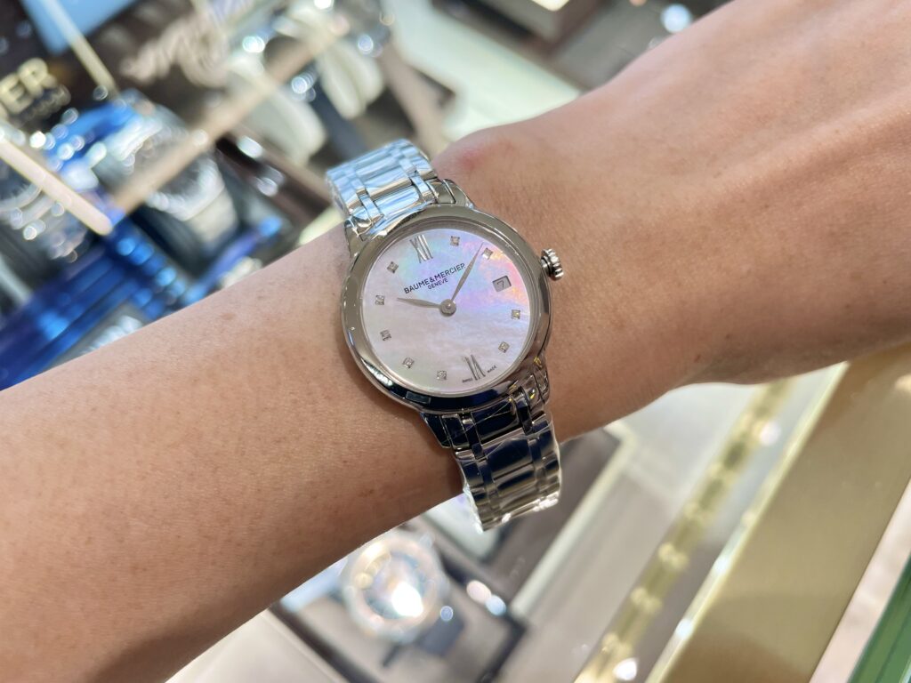 ボームアンドメルシエのクラシマです!なんともシンプルですが文字盤のシェルが光っており、虹色がきれいですね〜🥹✨サイズも小さめなので華奢な方でも着けやすい!こういうシンプルなのが1番使いやすいんですよね💁♀️
