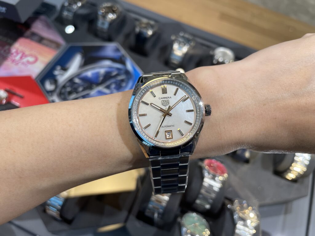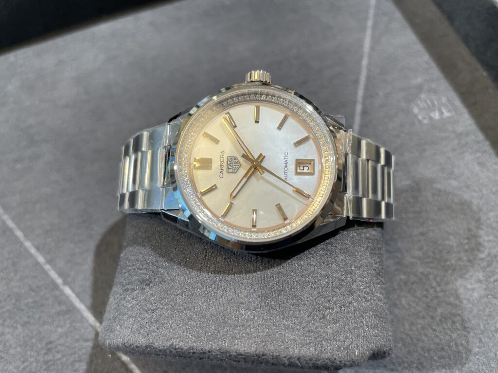 タグ・ホイヤー カレラ デイトが魅せる、タイムレスなエレガンスの世界へようこそ🥴💓直径36mmのケースに、ホワイトマザー オブ パール のダイヤルと、76個のダイヤモンド(0.288ct) がセットされたフランジを合わせた壮麗なタイムピースが、アイコニックなカレラ コレクションにラグジュアリーなタッチを添えます。