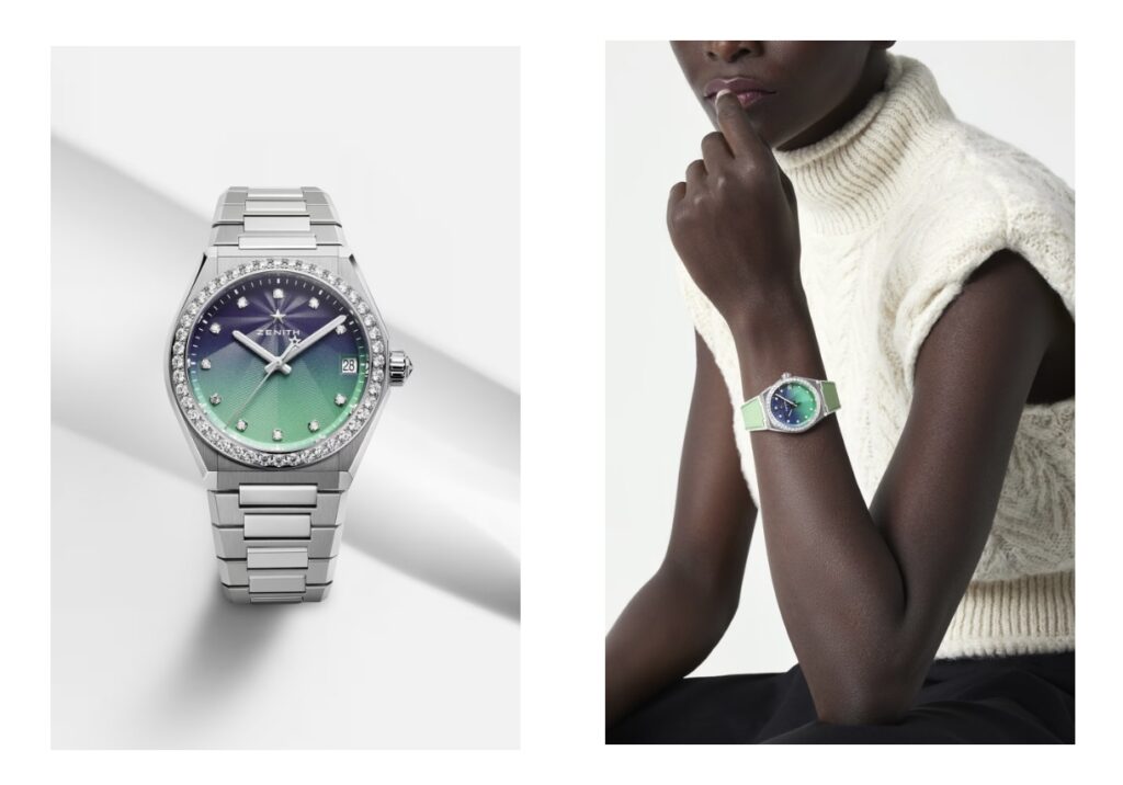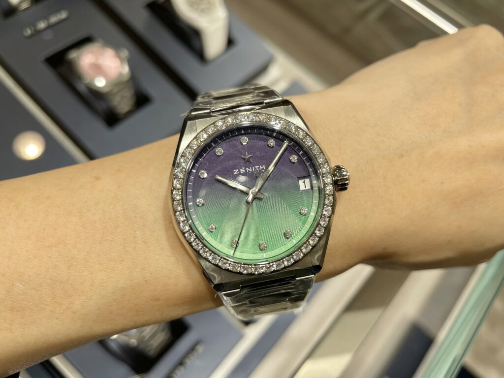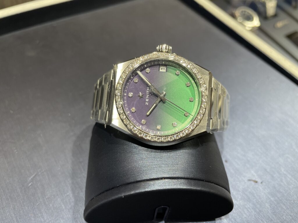 ゼニスの「デファイ ミッドナイト ボレアリス」です‼️こちらの時計は36mmのスチール製ケースとダイヤモンドがセットされたベゼル、ギョーシェ装飾が施され垂直方向にブルーからグリーンへのグラデーションカラーを持つ文字盤が取り付けられています。またスチール製ブレスレットと工具なしで簡単に交換できる複数のストラップを付属しているので、その日のコーディネートに合わせて時計もスタイルチェンジできちゃいます🥹