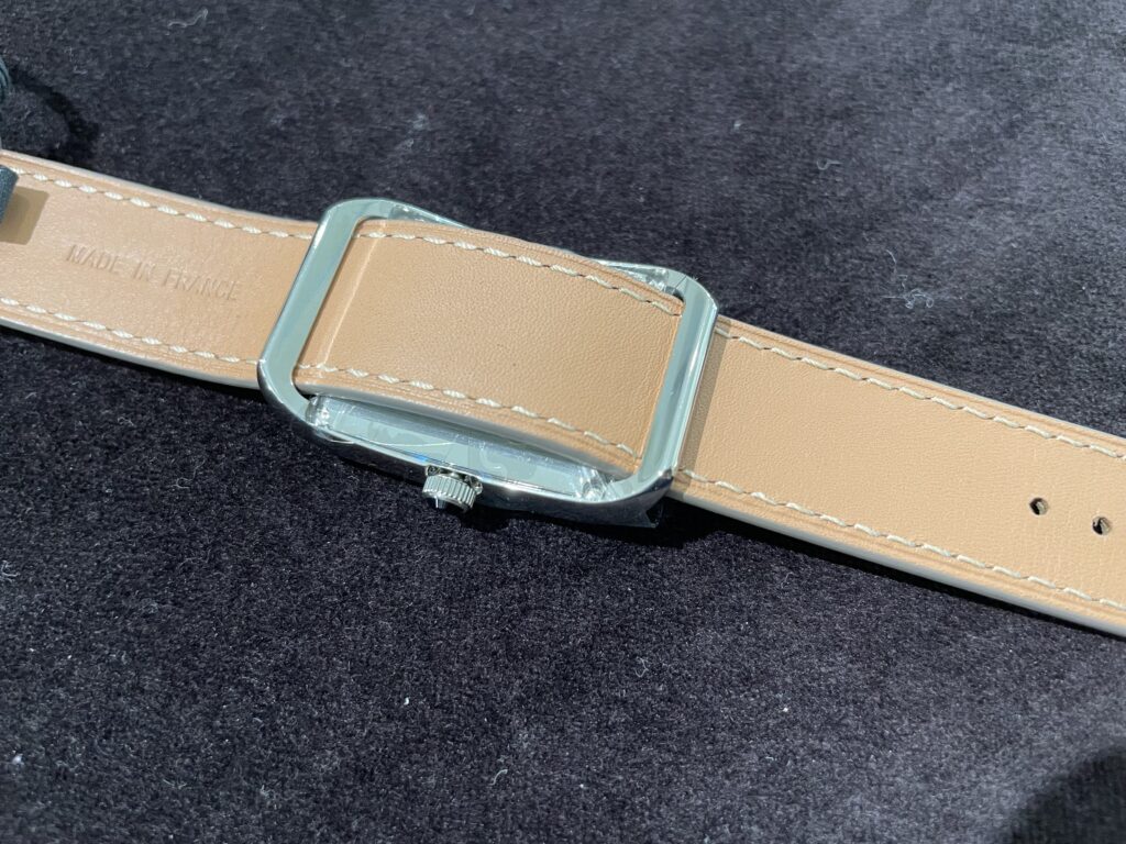こちらは美しく磨かれた湾曲ケース&オニキスカボションと左右対称に配された2桁アラビア数字インデックスのダイヤルが特徴的です☺️今回は小さめのMサイズのご紹介です!女性の方や小さめがお好みの男性にもピッタリです✨実はこの時計ストラップが引き通しになっており、替えのストラップがあればいつでも好きな時に交換することができます!下の画像にご注目👇