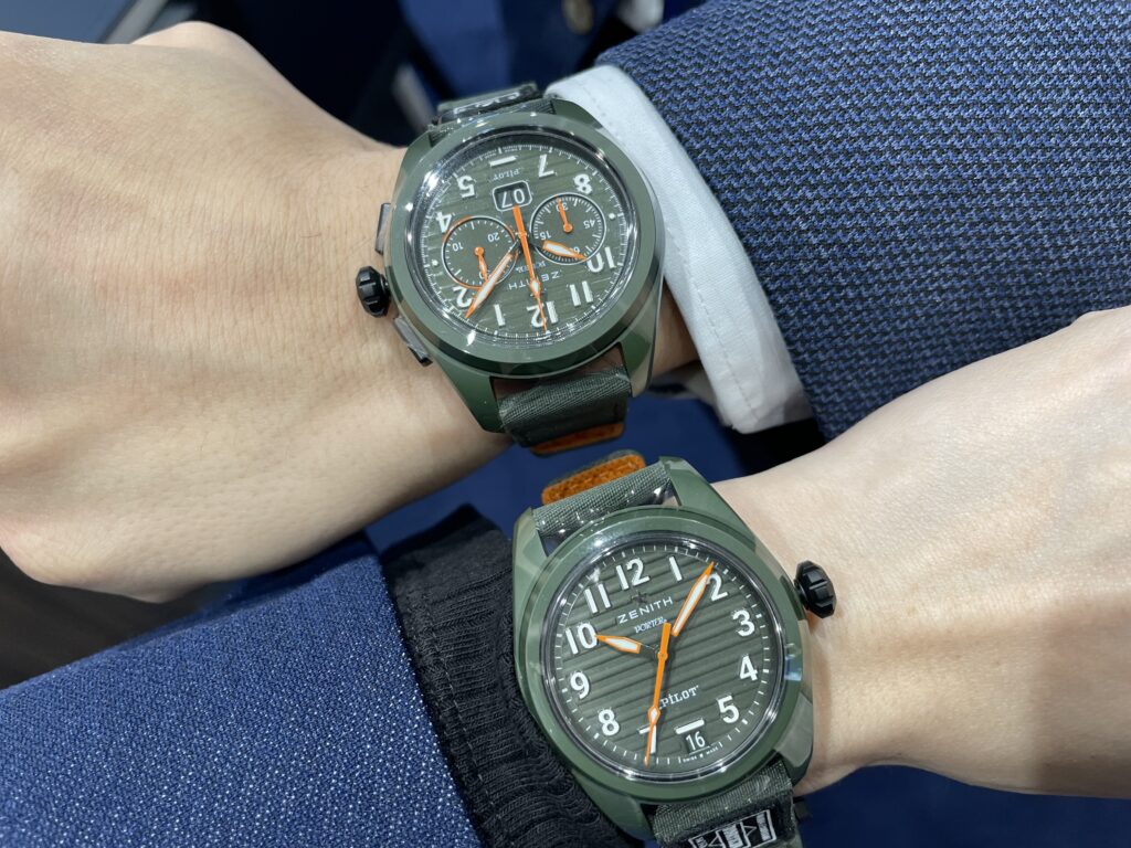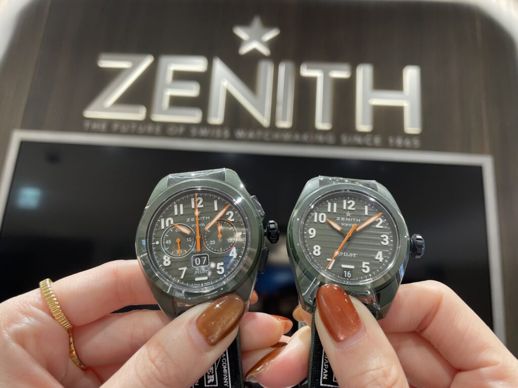 ゼニスのパイロット時計!500本限定のポーターエディションです‼️まだ店頭に在庫はございますよ〜🥴✨カーキグリーンセラミック製のケース、大型リューズ、波型のカーキグリーン文字盤、スーパールミノバを塗布した大型のアラビア数字で視認性も抜群です🙆‍♀️カラーがカーキでオシャレかつ、人と被りにくいのもポイントですよね😊😊