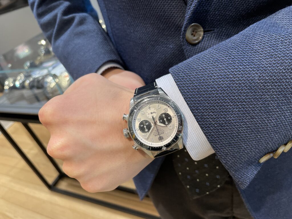 壮大な冒険旅行をイメージして開発された「タグ・ホイヤー オータヴィア 60周年アニバーサリー フライバック クロノグラフ」は、ヴィンテージ パイロットウォッチにインスパイアされた冒険心あふれるデザインです🏃♀️ブラックセラミック製ベゼルに囲まれたヒロイックシルバーのダイヤルがとてもカッコいいですよね!!またこの革ベルトは裏が赤くなっています😌それもまたポイントになりオシャレ感も増しています✨