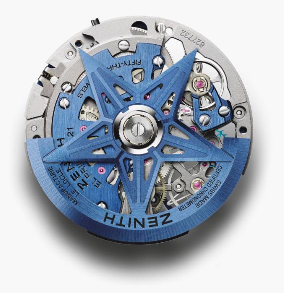 アプライドカウンターが付いたサファイア文字盤からは、50Hzと5Hzで鼓動する2つの脱進機を備えたブルーのエル・プリメロ 21自動巻ムーブメントを眺めることができます。