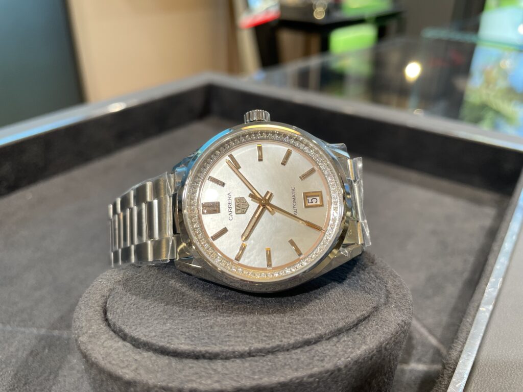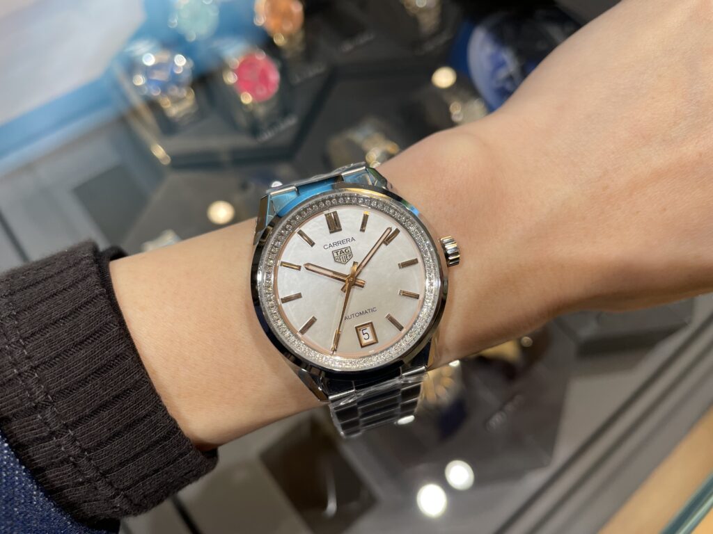 こちらの時計はタイムレスなエレガンスの世界へ連れて行ってくれそうです🥺直径36mmのケースに、ホワイトマザー オブ パール のダイヤルと、76個のダイヤモンド(0.288ct) がセットされたフランジを合わせた壮麗なタイムピースが、アイコニックなカレラ コレクションにラグジュアリーなタッチを添えますね✨着けるだけで気分が上がる!そんな一本ですね🤭