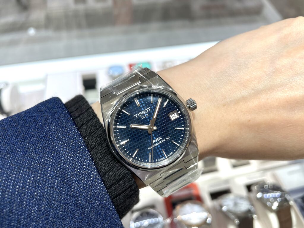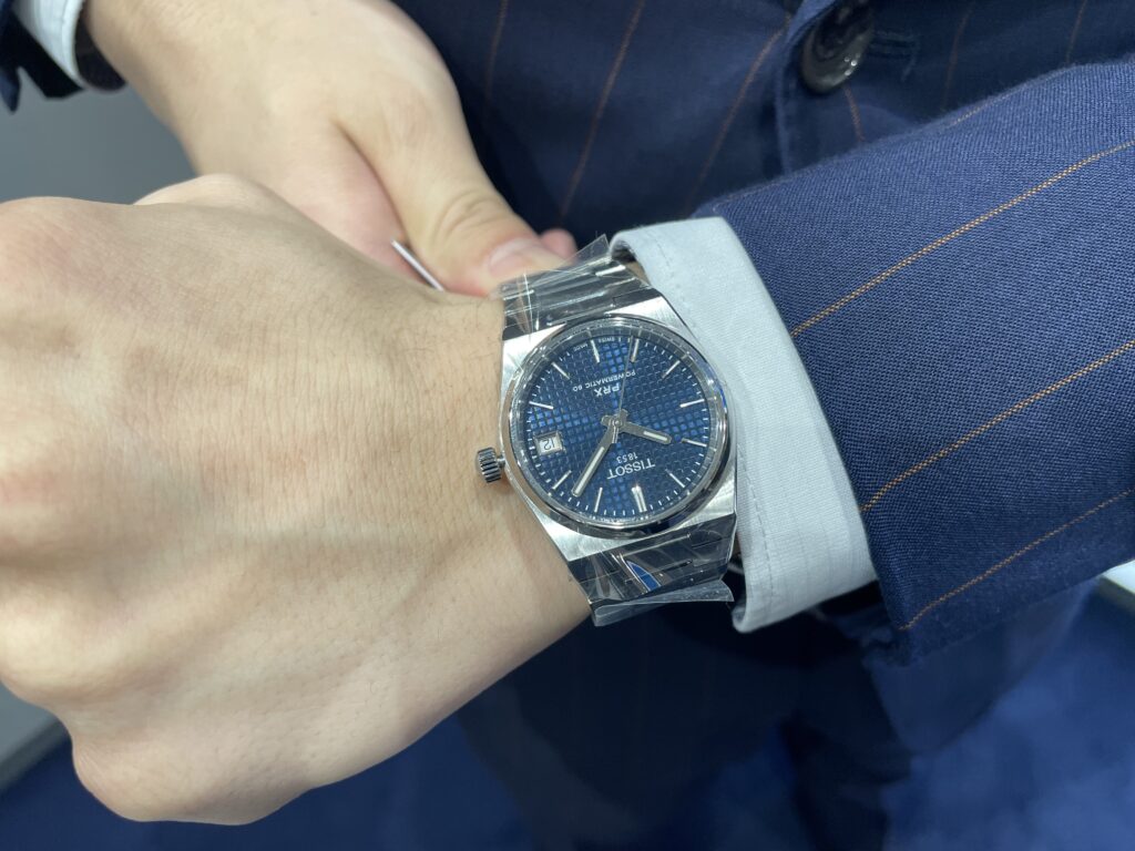 こちらは男性社員に着けてもらいました!やはり女性と違って少し小ぶりでスッキリ見えますよね😳同じ時計でも着用する人によってかなり見え方が変わってきます🙌PRXは本日紹介した35mmと少し大きめの40mmのご用意がありますので、着け比べてみていただくと自分にピッタリのサイズ感がわかると思います👏ぜひ店頭でお試しくださいね🌸