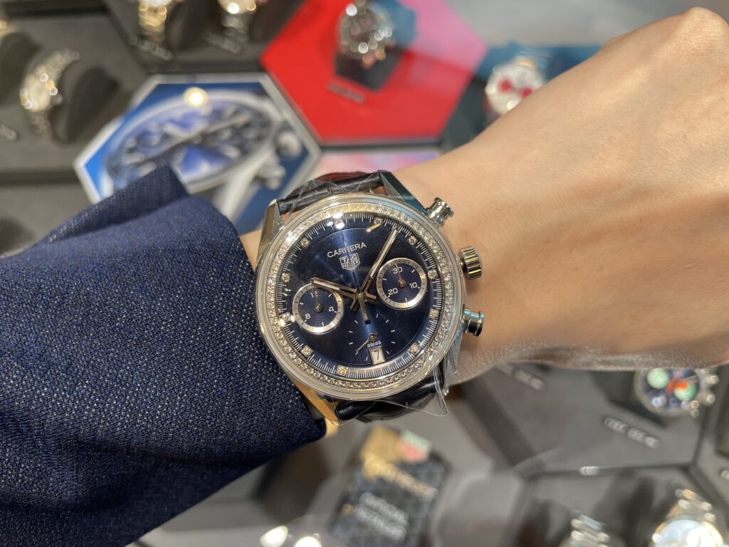 いかがでしょうか??割と細腕のわたしにも着用できちゃいます!またこちらは今まで発売していたカレラ クロノグラフと同じ39mmの大きさなのですが革ベルトが少し細身になっていて着用感が違いました😳😳時計が華やかな分、ベルトは華奢でバランスが取れていますね✨