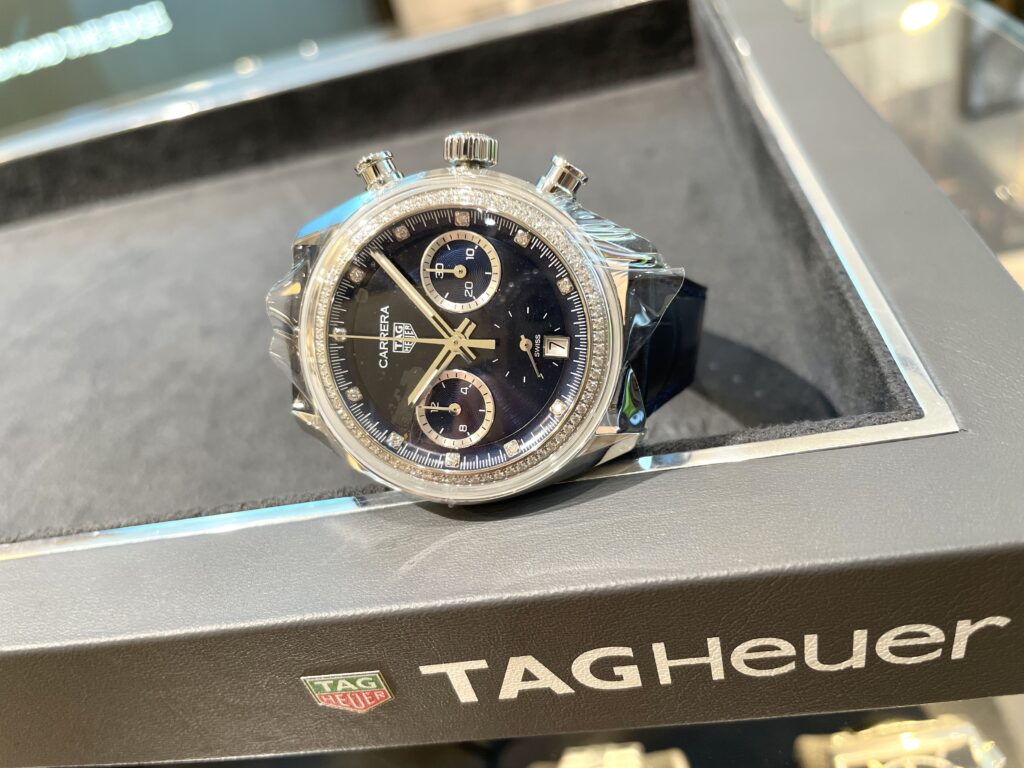 スポーティなスタイルに、シグネチャーブルーにセットしたダイヤモンドが煌めく、ケース径39mmのタグ・ホイヤー カレラ クロノグラフ。ブランドの革新的な「グラスボックス」を採用した、モダンな女性にふさわしい洗練されたデザインです😊