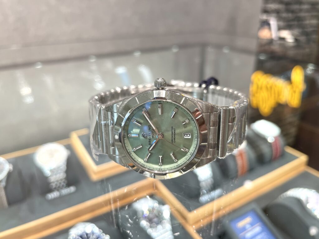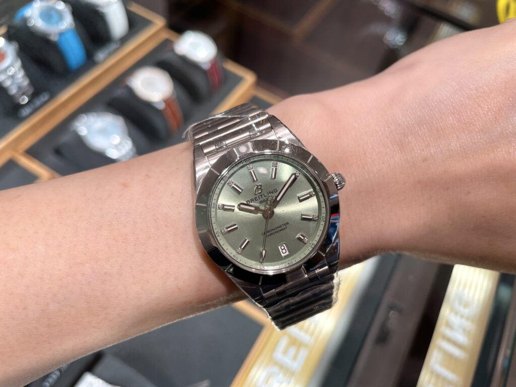 いかがでしょうか??しっかりエレガントに着けこなせていると自負しております。🙂↕️ブライトリングではあまり見ないペールグリーンの文字盤が店頭にいるとより私を見て!と輝いています💫サイズ感もちょうど良い🫶じかんもしっかり見れるのにブレスレットのようにおしゃれに着けこなせるなて、これは最強ですね❣️