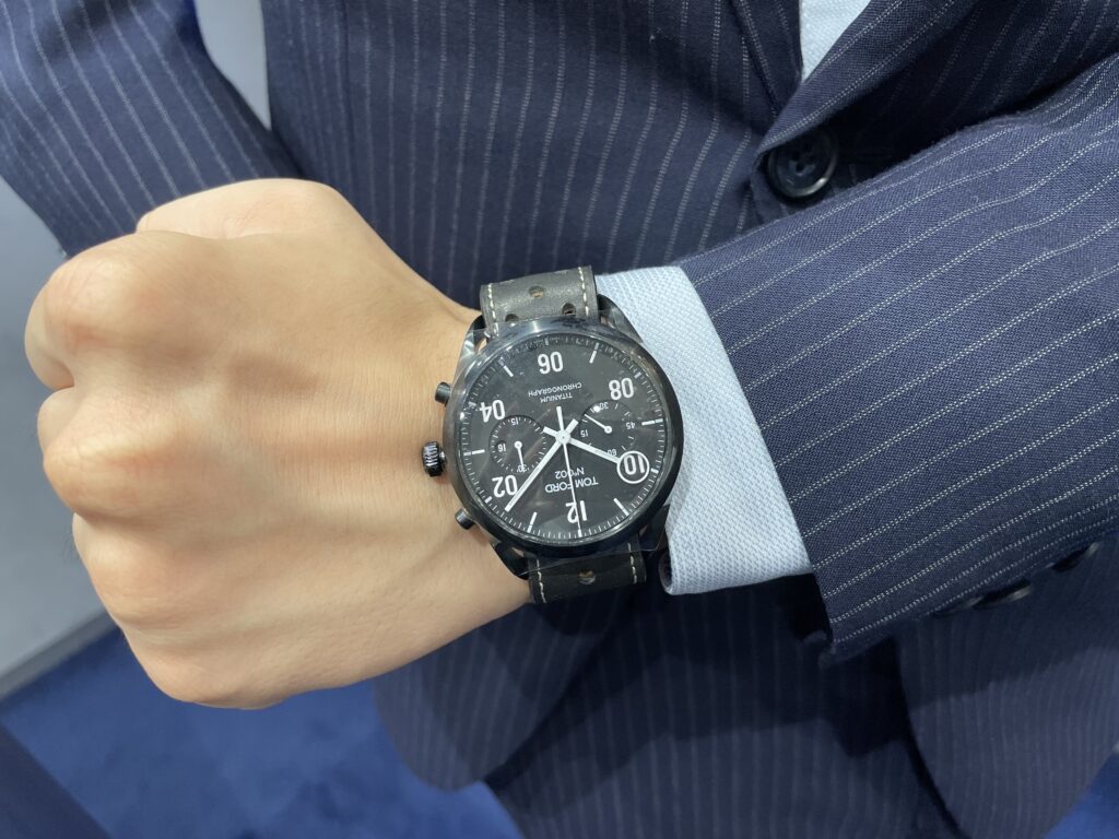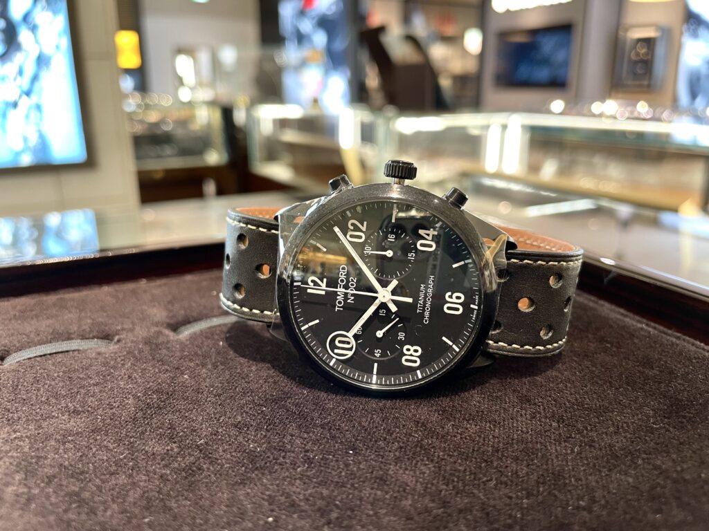 こちらの時計はチタニウムでできており、サイズが少し大きめなのですがとっても軽いです!またトムフォード初の世界限定150本エディション&自動巻きクロノグラフモデルとなっておりとても貴重な1本日となっております🥹🌟