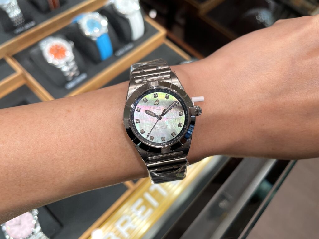 案の定、手が震えました。笑 自分でも見え方が変わりますが、周りの人も色が変わって見えるので目を惹く時計となっております😊クロノマット28はほかにもピンク、ブルーのパール文字盤もございますので見比べていただくのもおすすめです💕カラーが違うだけでだいぶ印象もかわります。以前ブログでも紹介しましたのでこちらも参考にしてみてください🤩