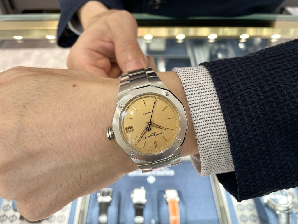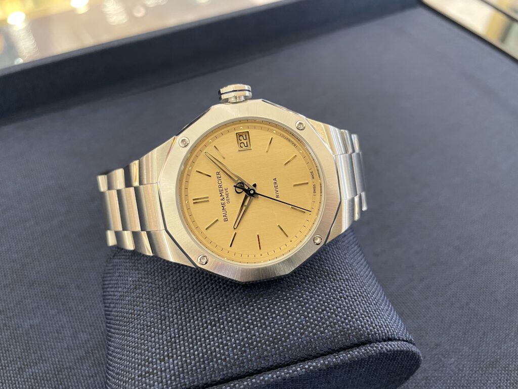 39mmのリビエラ 10822はサテンポリッシュ仕上げステンレススティールの12角形ケースを使用、反射防止加工サファイアガラスがカバーするゴールドカラーの文字盤はヴィンテージ風の明るい縦サテン仕上げです☺️今まであった自社製の文字盤はスケルトンが多かったのですが、今回はこのゴールドカラー!スペシャルエディションなだけあって特別感が漂います🌟秒針がブルーなのも素敵ですよね!