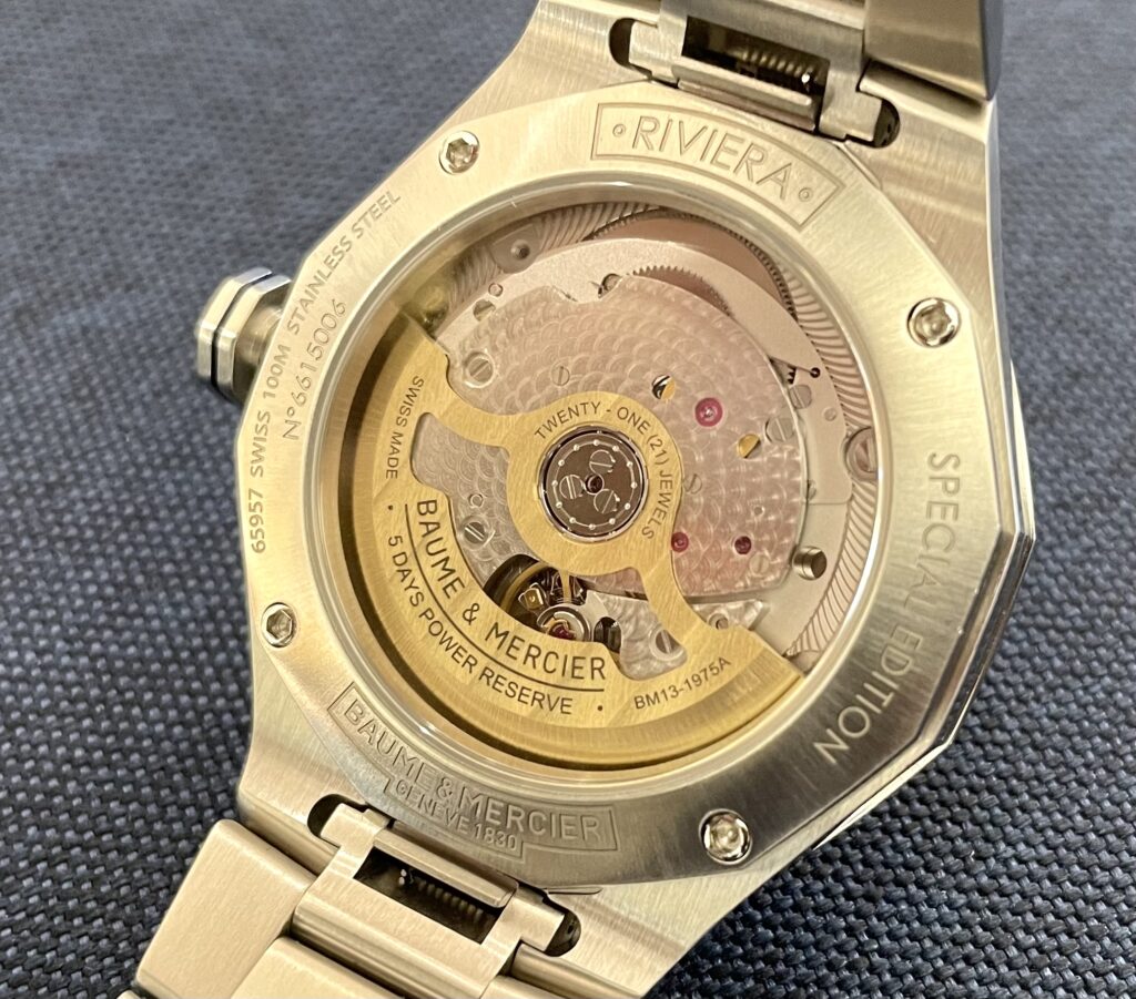 裏面まで美しいんです🥹🥹🥹機械を見ていつまでもお酒を飲めてしまいそうです…🥃もちろん自社製ムーブメントのボーマティックを採用❣️パワーリザーブが120時間と5日間ももつだなんて心強いですよね✊耐磁性も1500ガウスと高いので機械式時計でもあまり色々なことに気にせず使えるのは嬉しいポイントです。