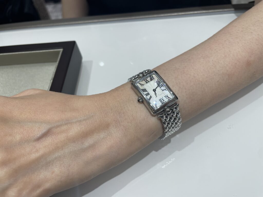 とってもお似合いでした☺️☺️少し小さめのロンジンのドルチェヴィータともお悩みでしたがブレスレットのオシャレさが決め手でしたね!お持ちの時計ともまた雰囲気が違って着け比べも楽しんでいただけると思います🤭暑い夏ですがステンレスベルトなのであまり気にせずお使いもいただけますね💫これからたくさんご使用していってくださいね🙌