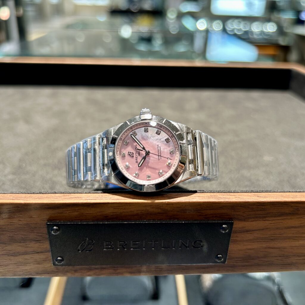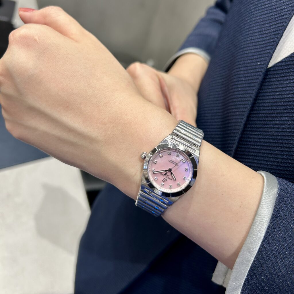 こちらのモデル、一番の特徴はピンクのマザーオブパールの文字盤。